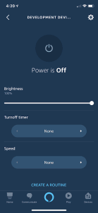 Here is an example of the User interface for light bulb control via Alexa App. User can easily power ON/OFF light. It can also set up the light brightness for the dimmable smart light. it can set up timer for turn off even create routine for example “turn on light when there is people presence detected” ,”turn off light at 9PM”; It can also create Scene when control a group of lights and set each device at its own unique setting.